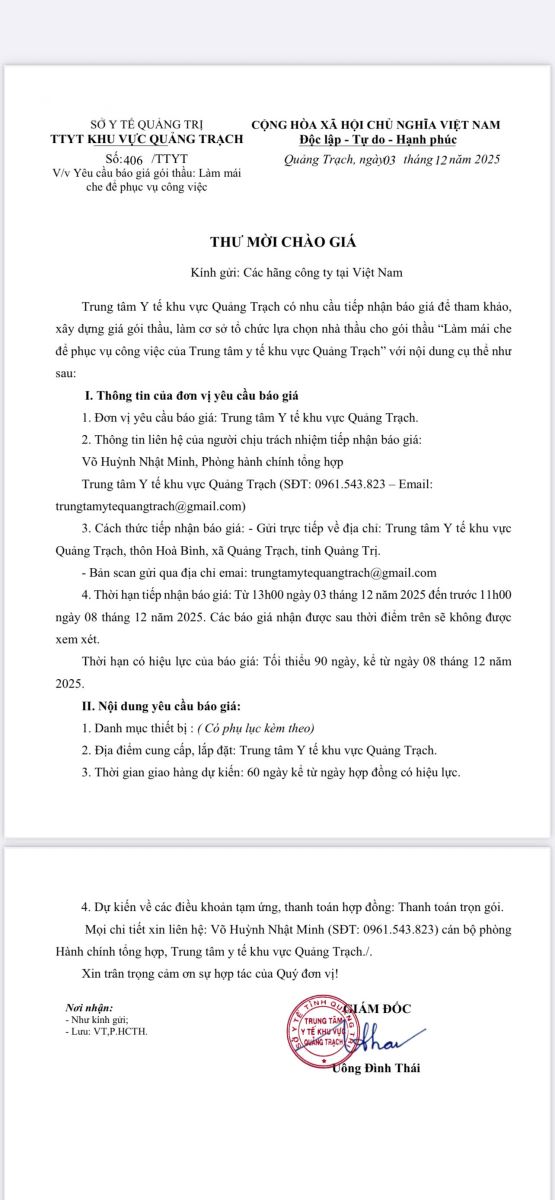 Yêu cầu báo giá gói thầu: Làm mái che để phục vụ công việc