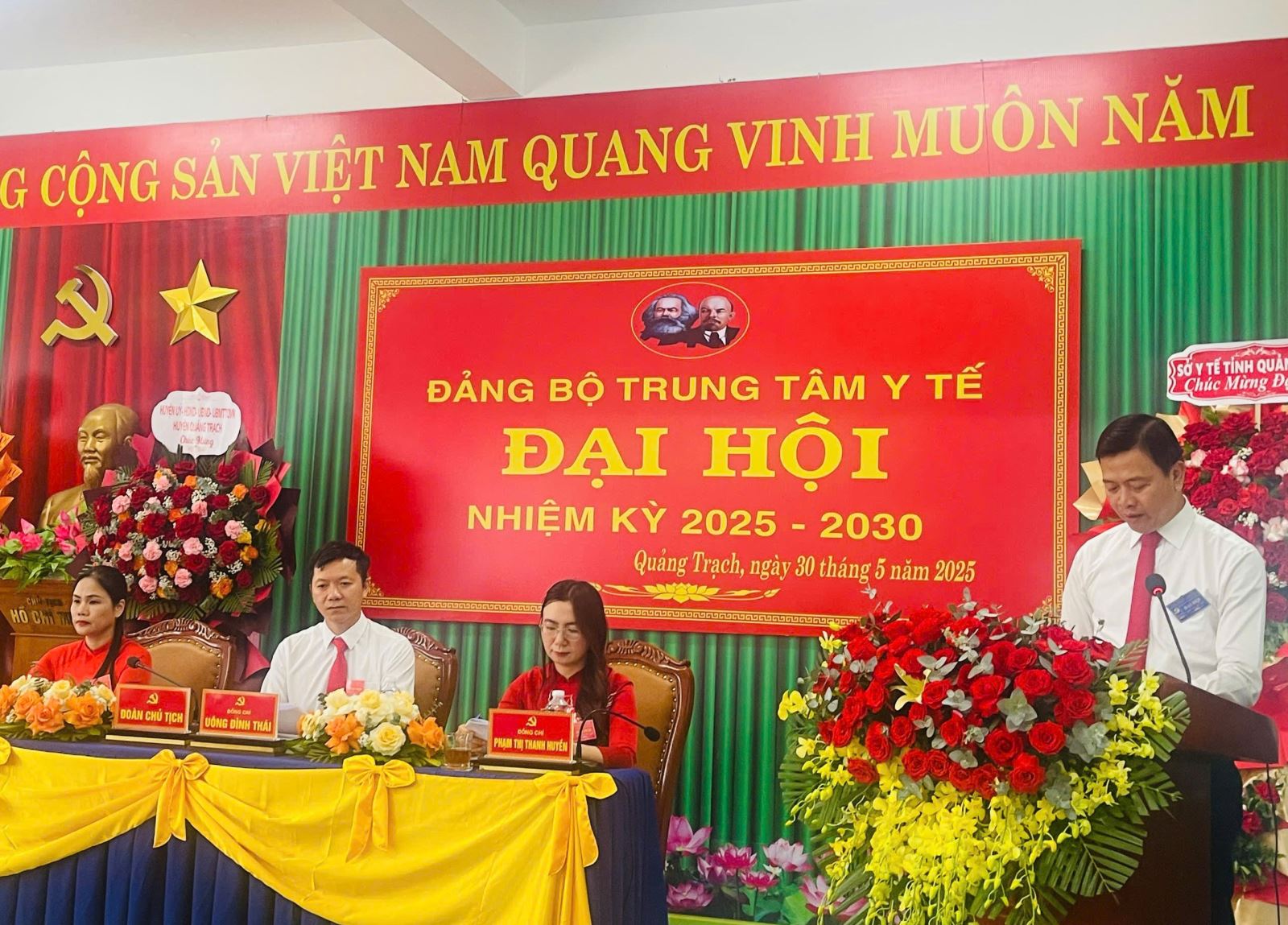 Đại hội vinh dự được nghe bài phát biểu của đồng chí Nguyễn Chí Thắng - Bí thư Huyện ủy Quảng Trạch phát biểu chỉ đạo Đại hội. Trong bài phát biểu, đồng chí đã ghi nhận, biểu dương những kết quả mà Đảng bộ Trung tâm Y tế đạt được trong nhiệm kỳ qua; đồng thời nhấn mạnh vai trò nòng cốt của ngành y tế trong sự nghiệp chăm sóc và bảo vệ sức khỏe nhân dân. Đồng chí đề nghị Đảng bộ Trung tâm cần tiếp tục phát huy tinh thần đoàn kết, nâng cao năng lực lãnh đạo và sức chiến đấu của tổ chức Đảng, đẩy mạnh cải cách hành chính, ứng dụng khoa học công nghệ trong khám chữa bệnh và không ngừng nâng cao chất lượng phục vụ người dân.